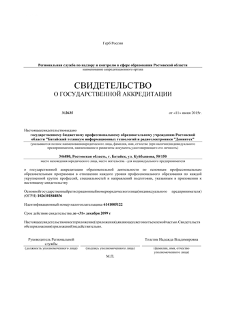 Свидетельство о государственной аккредитации. Серия 61А01 № 0002375, Регистрационный № 2634 от 11 июня 2015 года.