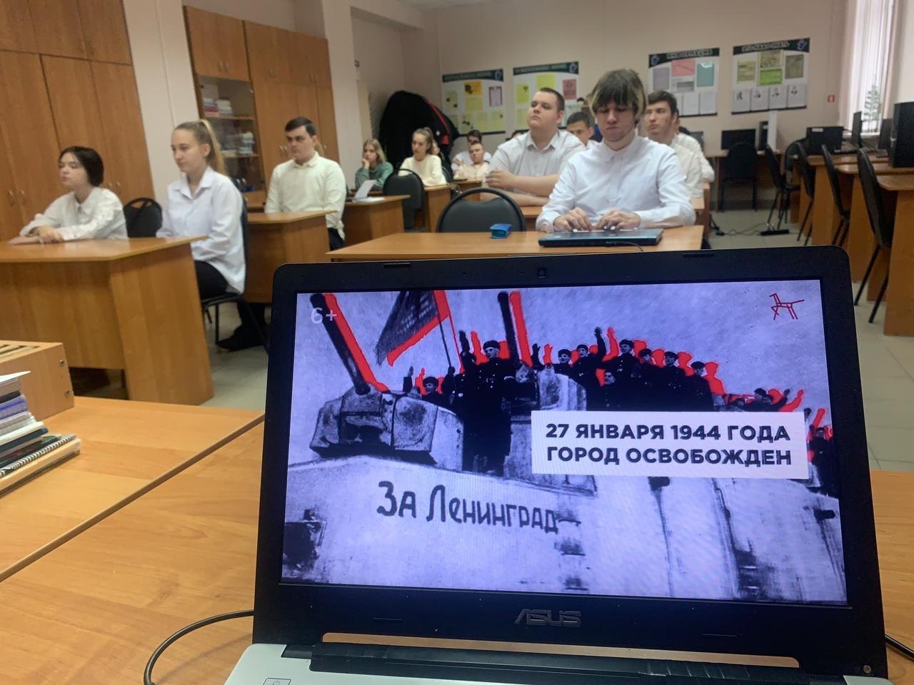Студенты познакомились с видеороликом: «Говорим о важном с Н.В. Строгоновой, жителем блокадного Ленинграда», а также с архивными фотографиями и документами, связанными с блокадой Ленинграда, вспомнили историю осажденного города.