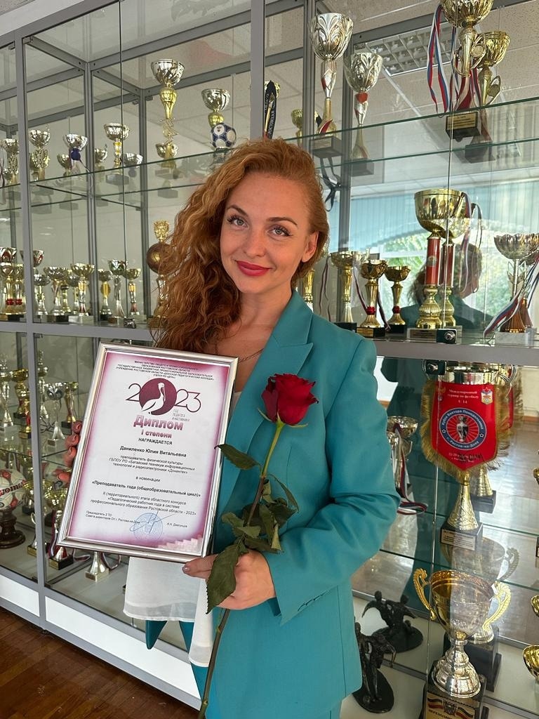 ГБПОУ РО "БТИТиР" на конкурсе представляла преподаватель физической культуры Юлия Витальевна Даниленко. Успешно пройдя все задания конкурса, Юлия Витальевна заняла почётное I место. Поздравляем нашего педагога с заслуженной победой и желаем дальнейших успехов и творческих находок!