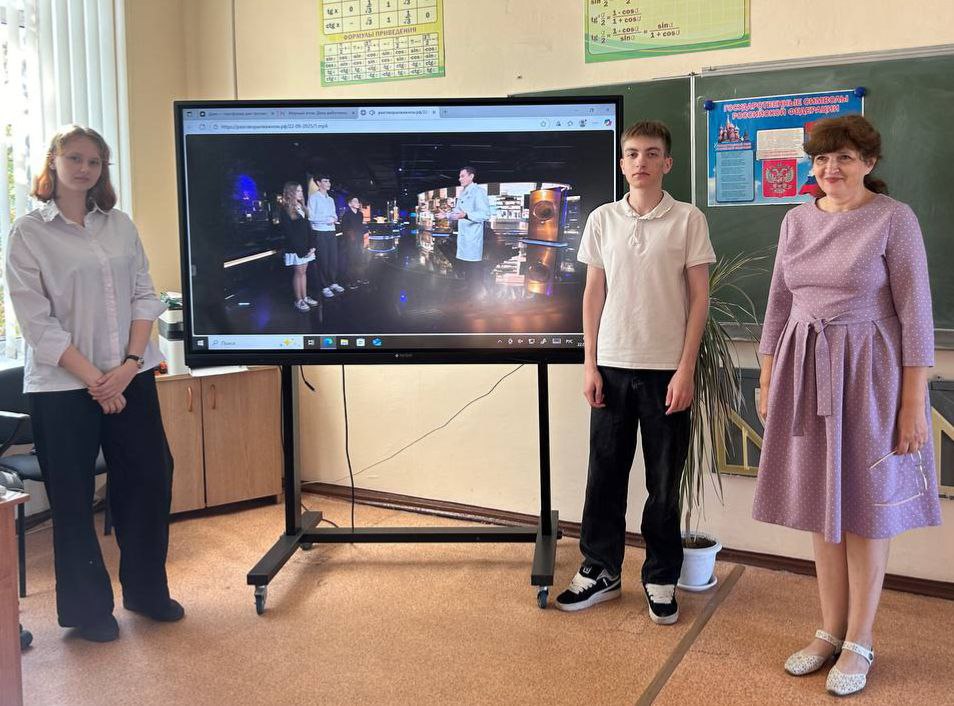 Студенты посмотрели видеоролики: «Видеоанонс темы от Евгения Егорова», «Говорим о важном с Владиславом Парфеновым», «Росатом: Гордость. Вдохновение. Мечта» и фрагмент телешоу «Классная тема» с Михаилом Скрипкиным, посвящённый значению атомной энергетики.