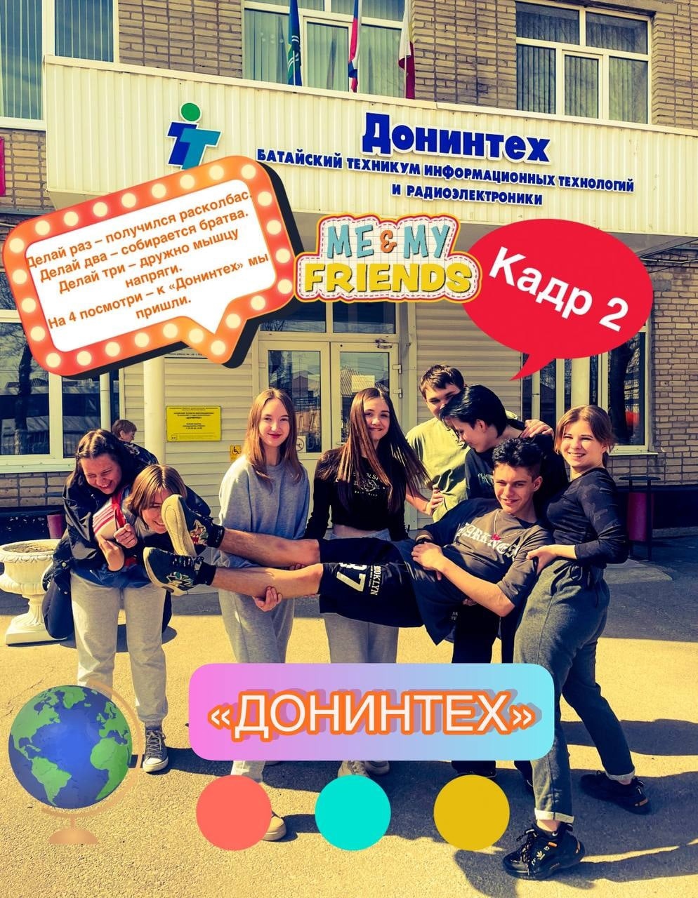 На втором кадре мы остановились возле нашего техникума, место, где проводим больше всего время вместе и тут встретили нашего Санька.